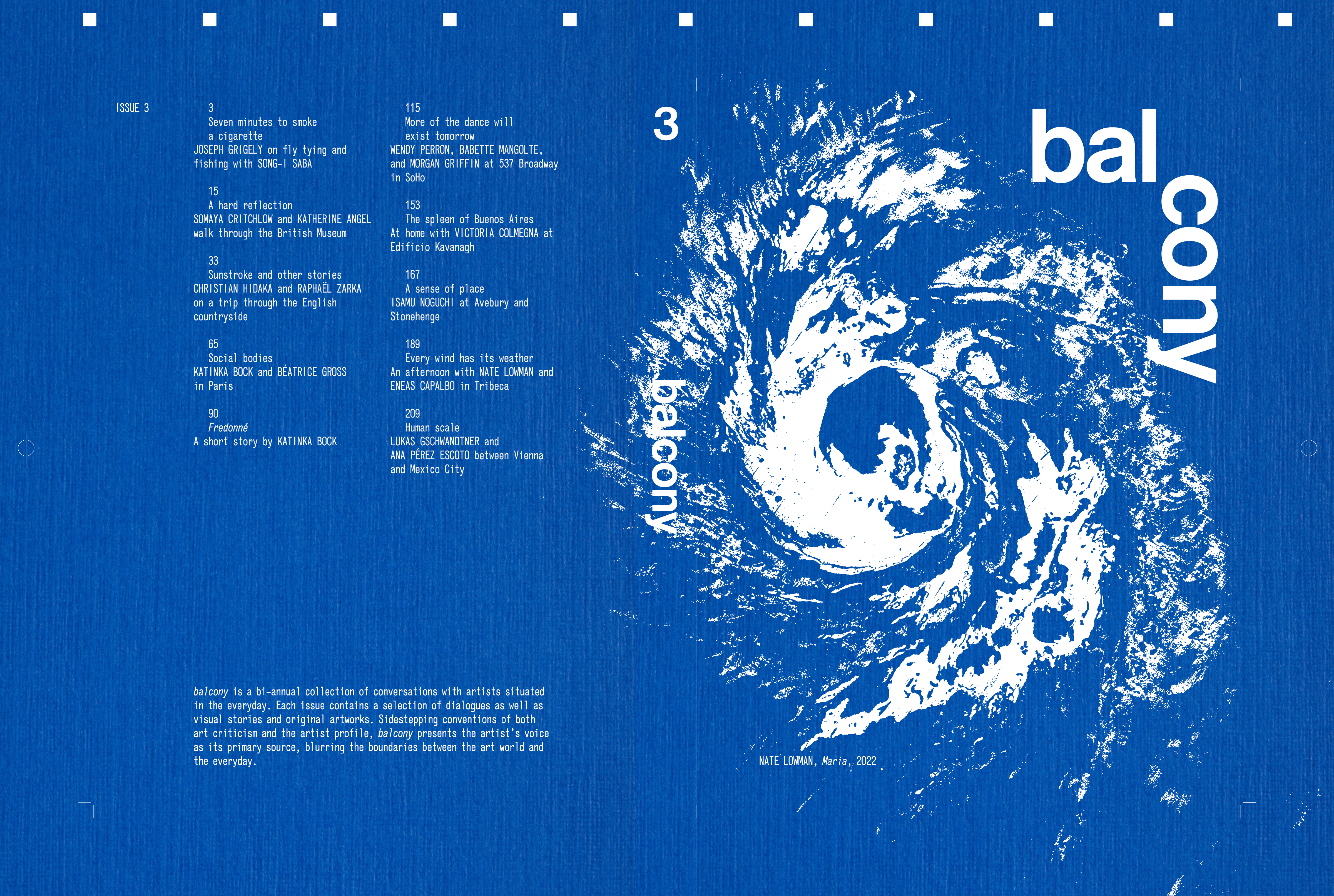 balcony is a bi-annual collection of conversations with artists situated in the everyday. each issue contains a selection of dialogues as well as visual stories and original artworks. sidestepping conventions of both art criticism and the artist profile, balcony presents the artist’s voice as its primary source, blurring the boundaries between the art world and the everyday.